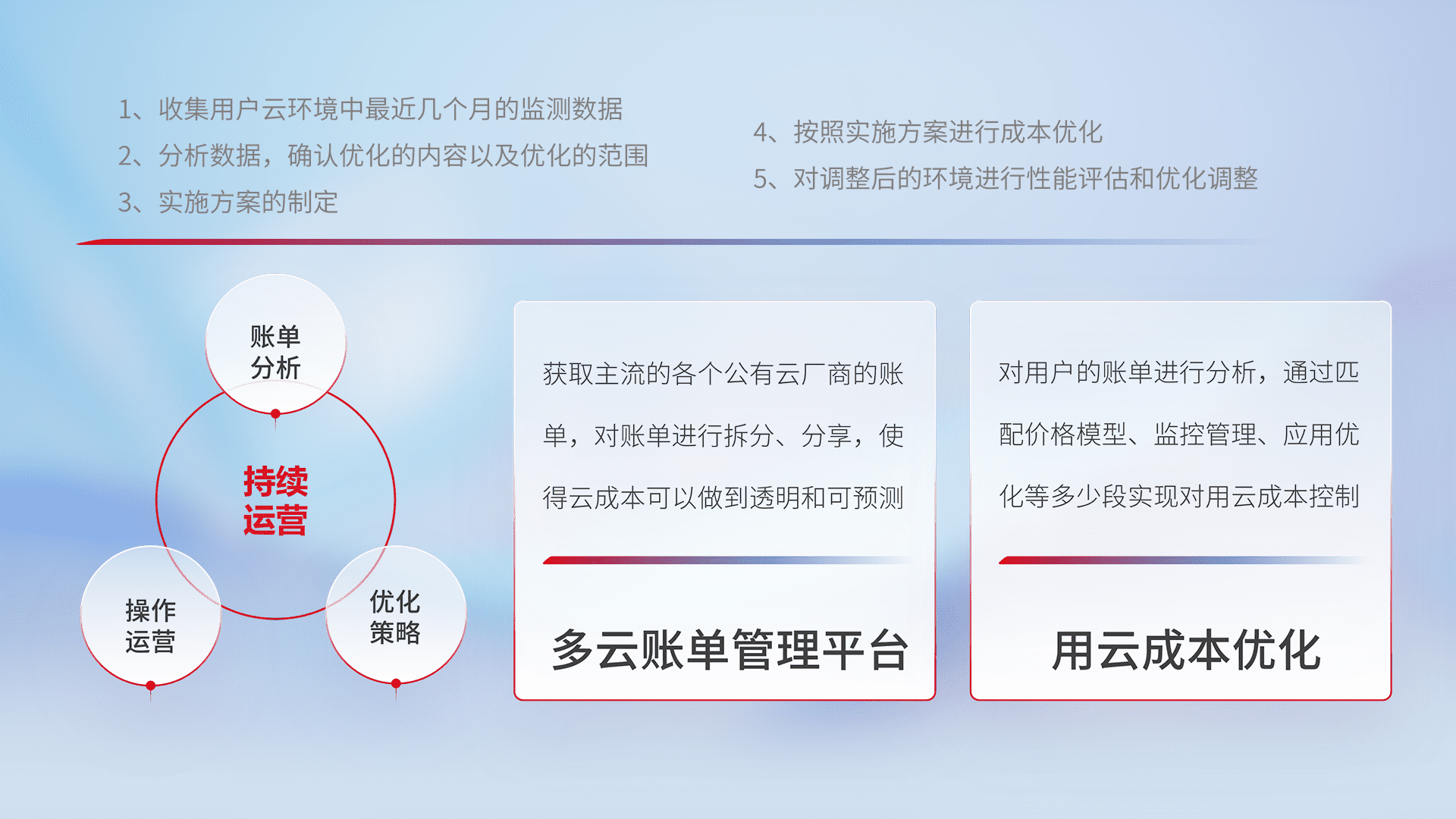 通过多云纳管,,,,以统一的资源数据模型把客户的云资源进行抽象和封装,,进而实现对多云资源的统一操作,,保障云资源管理的可靠性、、、、稳定性与可用性。。。。量身定制化运维内容,,配置、、、开发运维、、、、补丁管理、、、、备份、、、、监控、、、认证和访问管理、、审计和日常巡检等,,,,保障在用云过程中的可靠度,,,,稳定度以及高可用率。。。